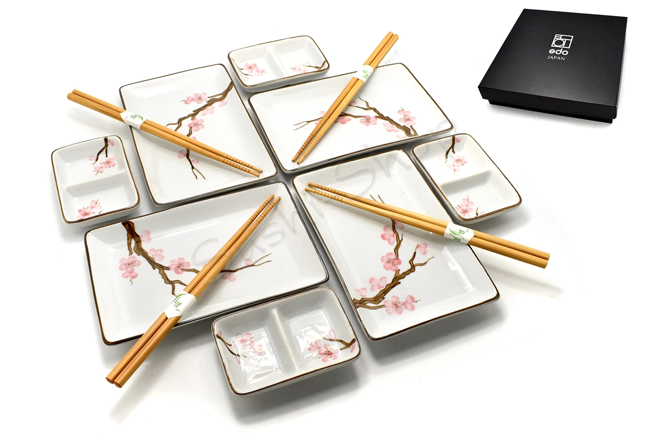Elegancki porcelanowy zestaw do serwowania sushi, inspirowany japońską estetyką i subtelnym motywem kwitnącej wiśni (sakura). Idealnie sprawdzi się podczas rodzinnych kolacji, spotkań ze znajomymi czy romantycznych wieczorów we dwoje.