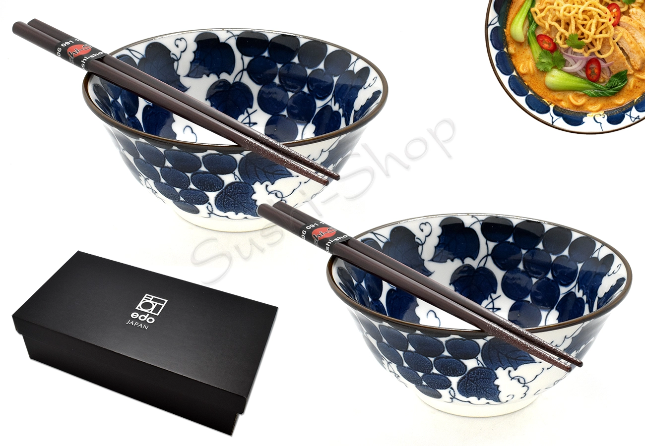 Elegancki zestaw dwóch porcelanowych misek Budoi Blue  o pojemności 400 ml to idealny wybór do serwowania ramen, makaronów, ryżu, sałatek czy zup azjatyckich. Wnętrze misek zdobi klasyczny japoński wzór w odcieniach głębokiego granatu i bieli, który nadaje im unikalny, rękodzielniczy charakter.
