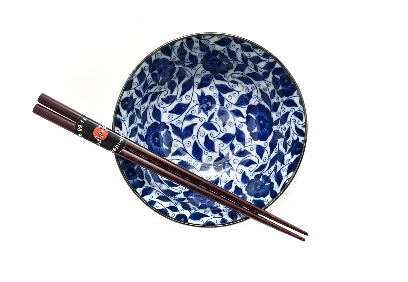 Zawartość zestawu: 2 miski o pojemności 400 ml, 2 pary pałeczek oraz eleganckie czarne pudełko prezentowe.
