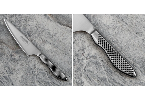 Wykonany jest z jednego kawałka wysokiej jakości stali nierdzewnej (stal CROMOVA 18), co zapewnia mu trwałość, odporność na korozję oraz długotrwałą ostrość. Charakterystyczna, lekka i dobrze wyważona rękojeść z perforacją (dla lepszego chwytu) zapewnia wygodę i bezpieczeństwo podczas pracy. Całość ma nowoczesny, minimalistyczny design typowy dla noży Global – estetyczny i funkcjonalny.