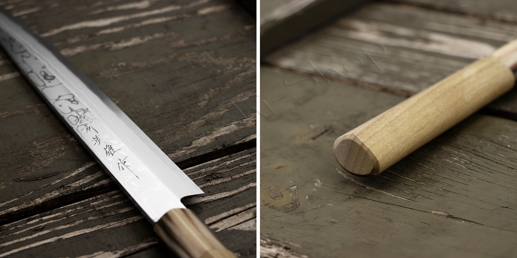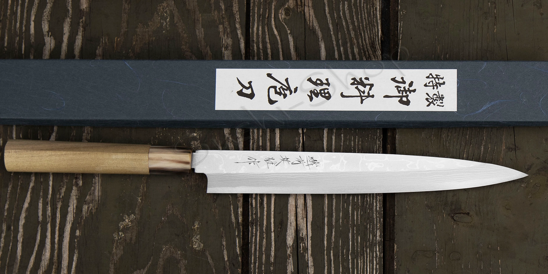 Ten elegancki i smukły nóż Yanagiba został wykonany ręcznie przez mistrza kowalstwa Hideo Kitaokę, znanego z tradycyjnego podejścia do japońskiego rzemiosła nożowniczego. Klinga ma długość 24 cm, co czyni go wszechstronnym narzędziem dla profesjonalnych kucharzy i pasjonatów kuchni japońskiej.